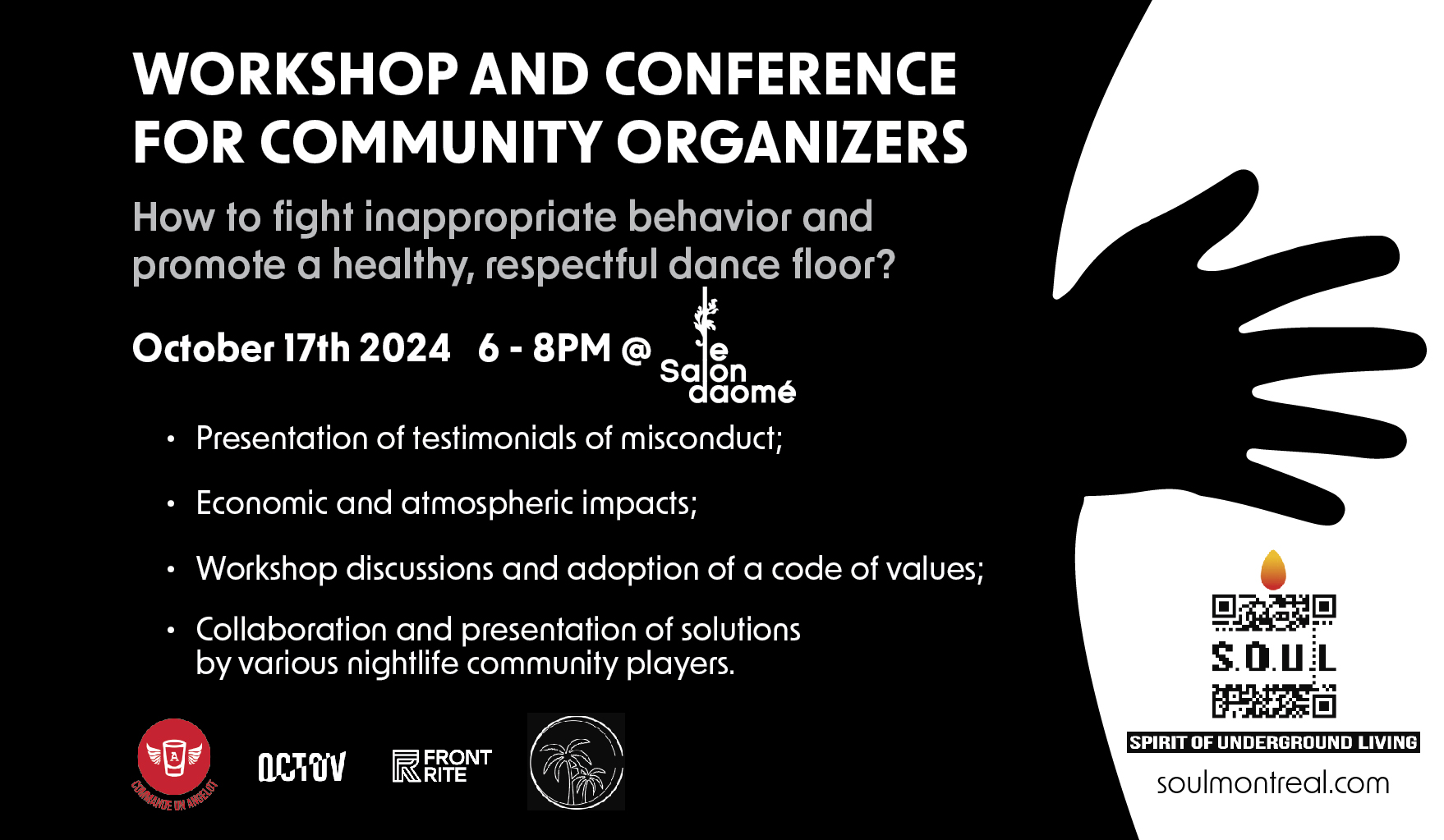 On Thursday, October 17, 2024, S.O.U.L (Spirit Of Underground Living) MONTREAL invites you to a discussion and training workshop on the composition and adoption of a code of values and good conduct in Montreal’s underground scene.